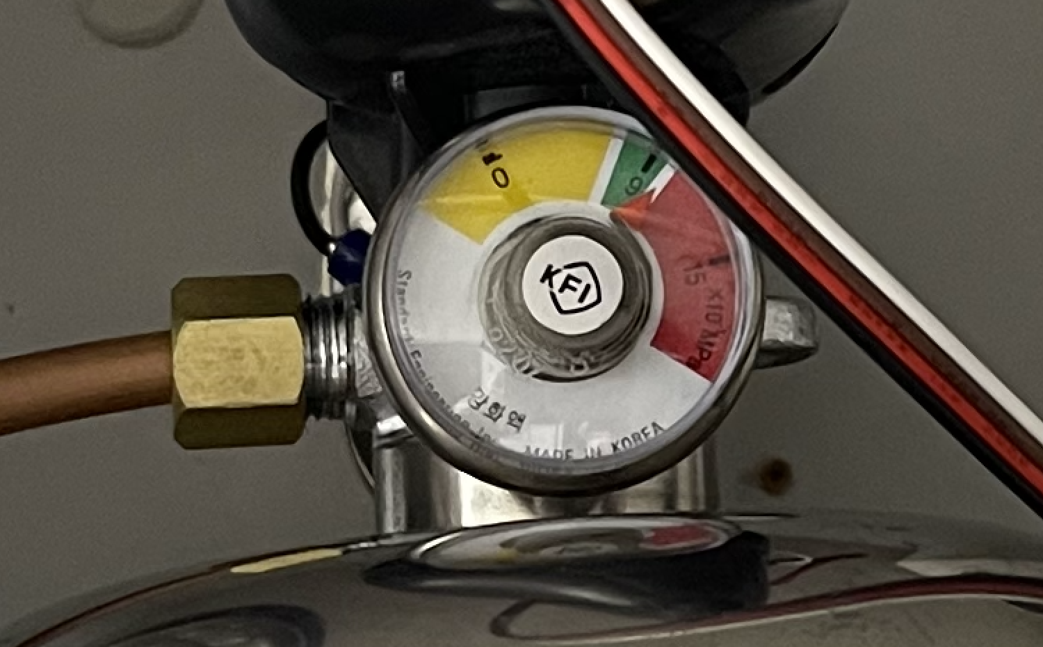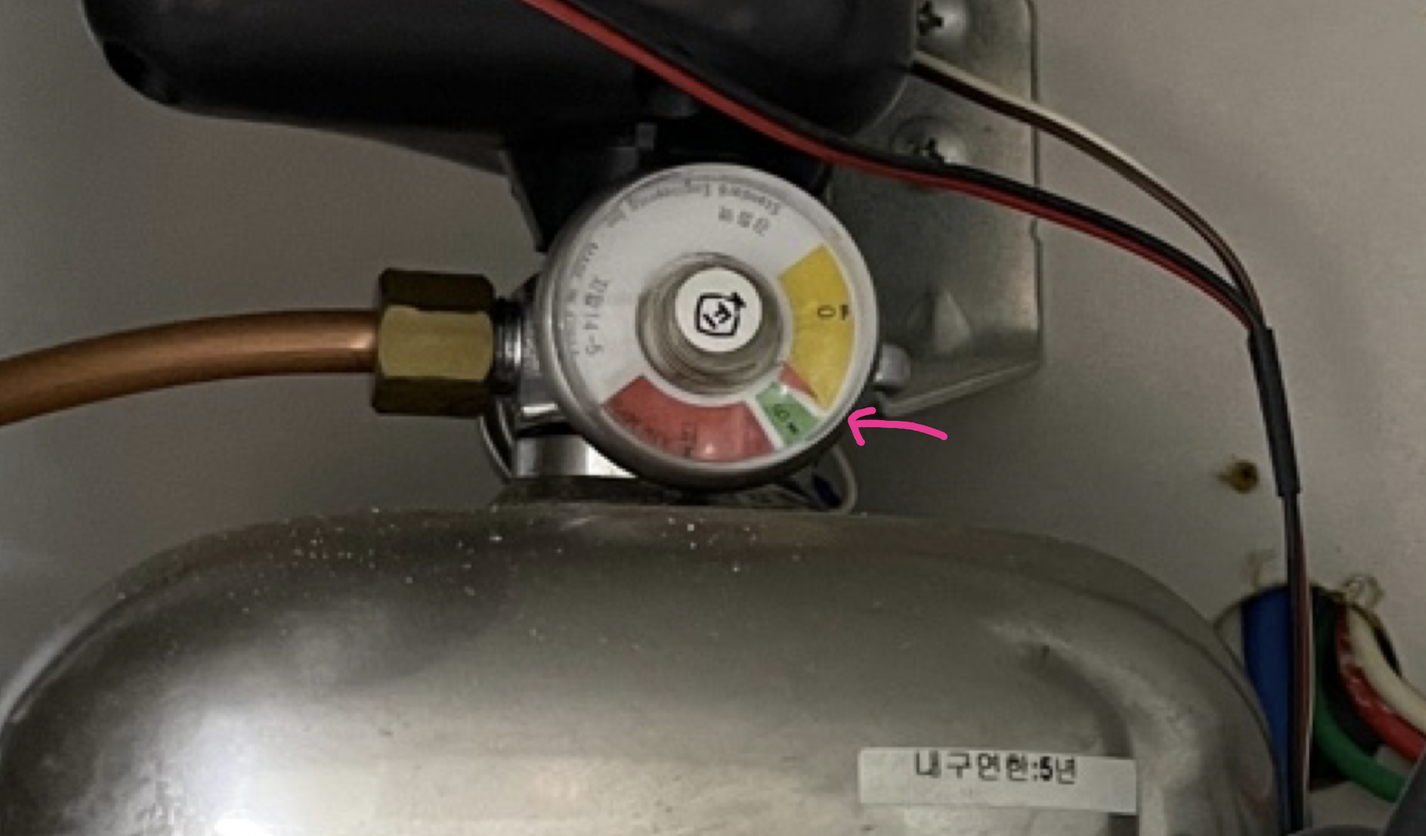 압력게이지는 초록색과 빨간색 사이정도에 위치하고 있네요.