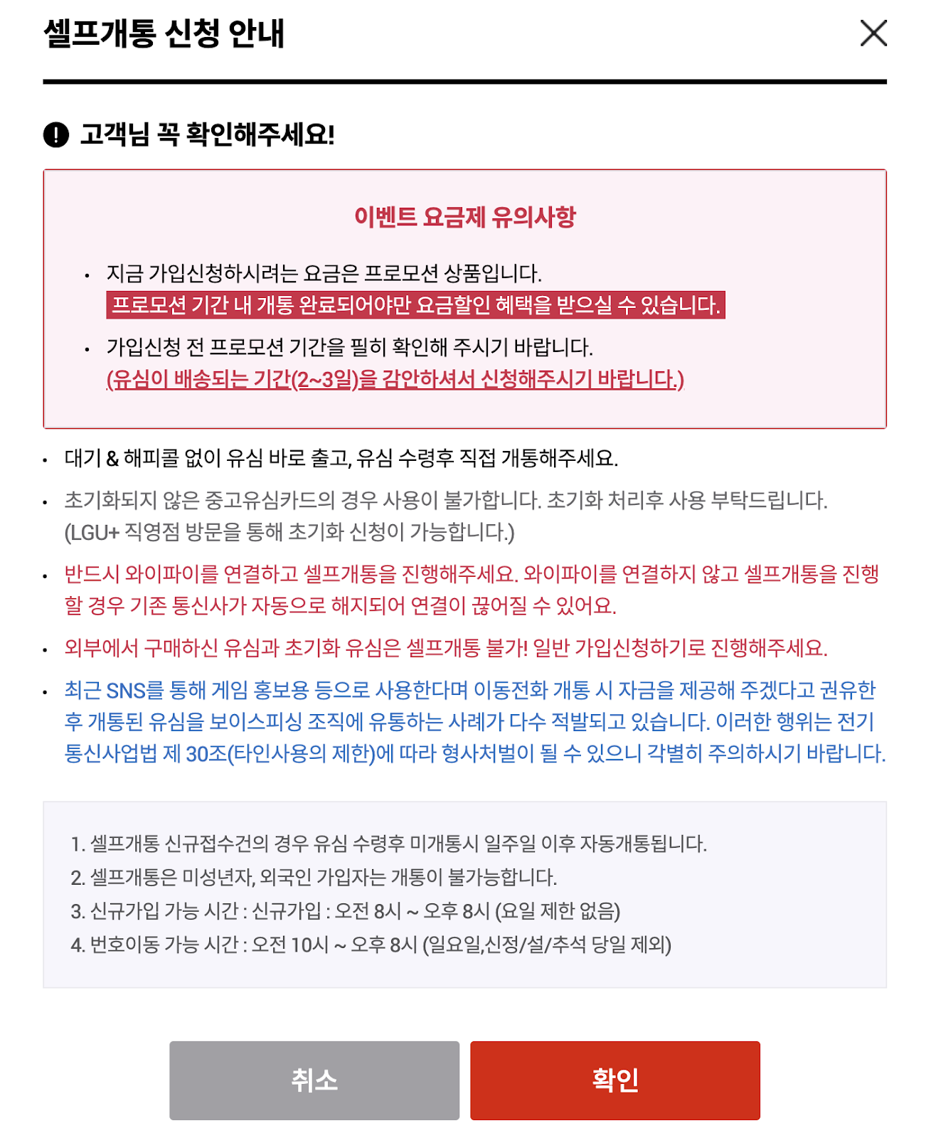 프로모션 기간이 지나버리면 요금할인 혜택을 받을 수 없다고 하니 시간을 잘 보고 프로모션 기간 종료를 넉넉히 남겨두고 진행하는 것이 좋을 거 같습니다. 마지막날에 가입하려고 했는데 저처럼 유심을 잃어버린다거나, 유심을 배송 신청하는 경우 늦게 도착할 수도 있고, 어디선가 인증에 실패할 수도 있으니 말이죠.