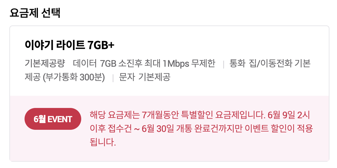 세월이 지나면서 알뜰폰 요금제도 좋은 상품들이 많이 나왔습니다. KT EGG를 더 이상 사용하지 않아도 될 것 같은 상품들이 나오기 시작했지만 KT EGG는 2년 약정을 걸어둔 상태였기 때문에 약정이 끝날 때까지 기다리고 있었습니다. 그리고 2023년 6월 드디어 KT EGG 약정이 끝났습니다. 마침 알뜰폰 요금제는 행사가이긴 하지만 0원 요금제이면서 통화, 문자 무제한에 데이터도 7GB 제공에 소진 시 1 MBps 속도로 무제한 제공도 되는 상품들도 나왔습니다. 그중에서도 눈에 띄었던 것이 바로 이야기모바일의 이야기 라이트 7GB+ 요금제였습니다.