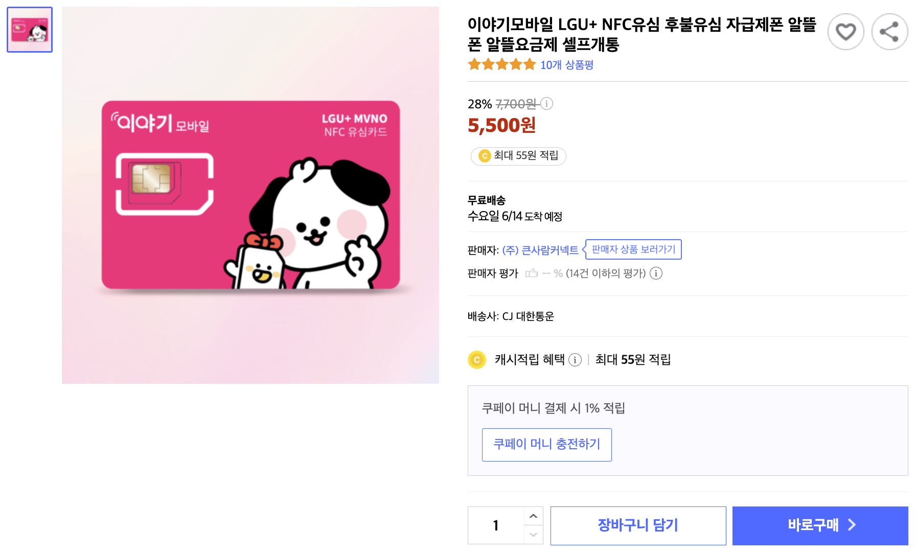쿠팡에서 NFC유심을 팔고 있어서 5,500원에 구입했습니다.