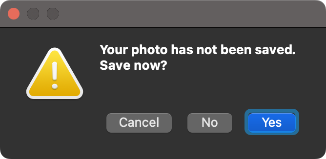 맥에서는 아래처럼 Yes, No, Cancel 같은 버튼을 선택하는 선택창이 나올 때 마우스로 선택해야 합니다. 키보드를 많이 사용하신다면 키보드로 선택되면 좋겠는데 기본적으로 키보드로 선택이 안됩니다.