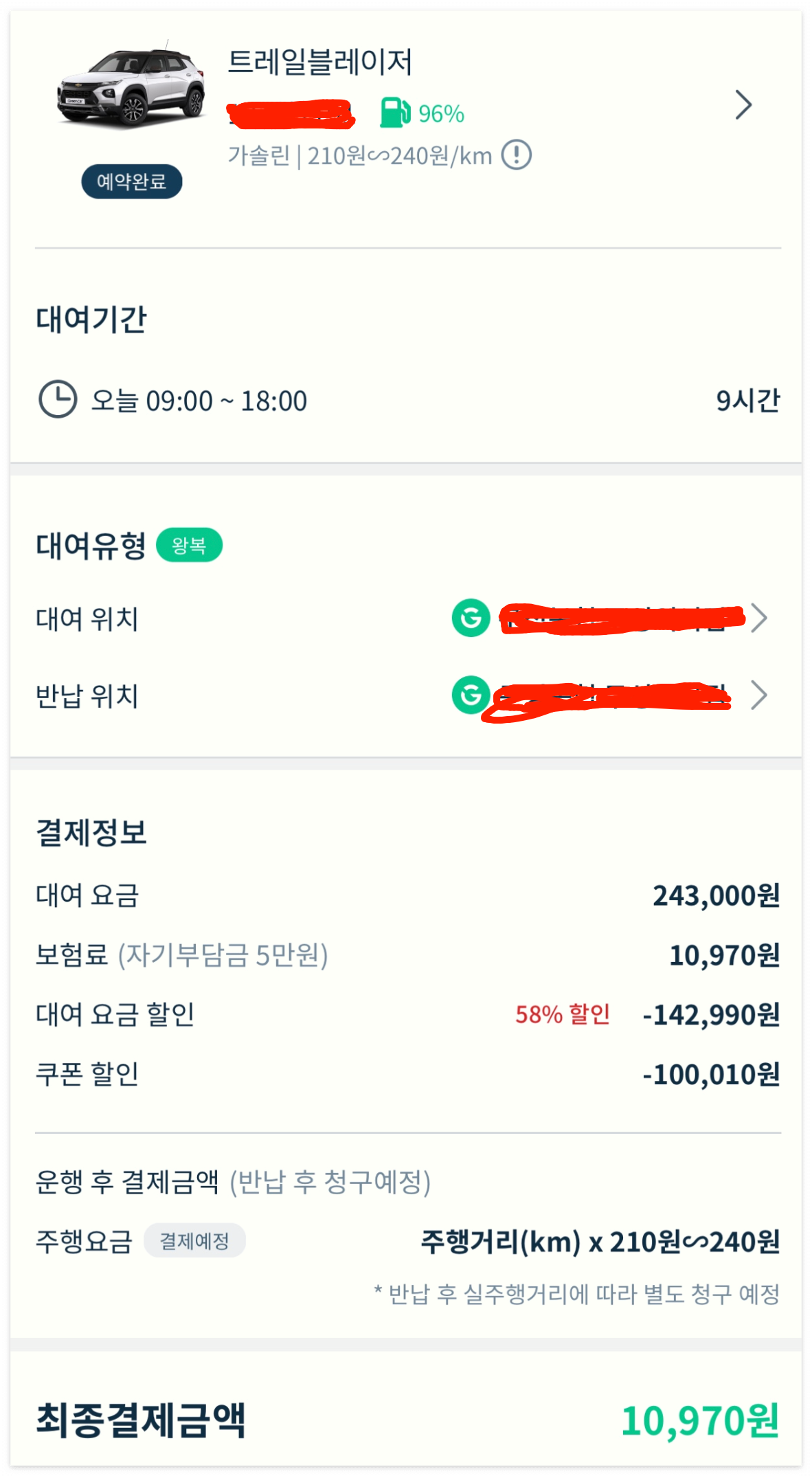 보험료인 10,970원에 렌트할 수 있으니 꽤 괜찮은 조건이라고 생각했습니다. 다만 그린카는 쏘카처럼 내가 원하는 곳에 차를 가져다주는 부름 서비스가 없어서 그린카존에 가서 차를 대여해야 했습니다.