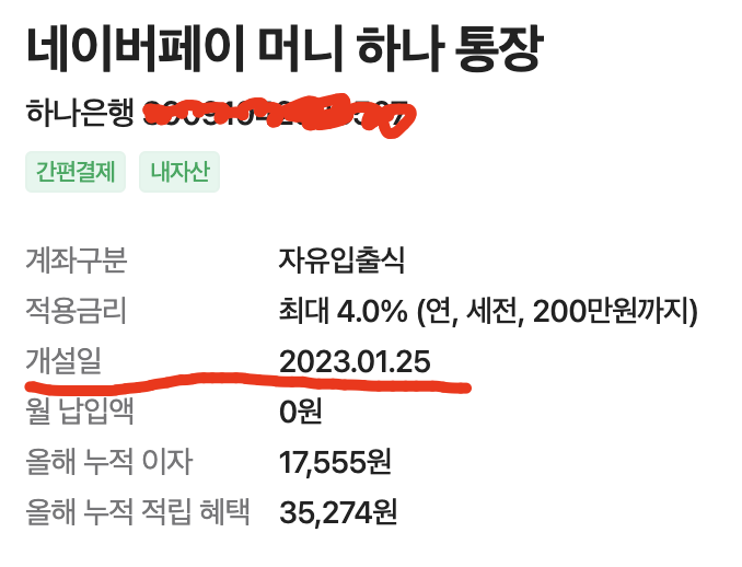 네이버페이 머니 하나 통장은 2023.01.25에 개설했으니 금리 혜택 기간인 1년 만기가 도래하는 2024.01.25 에는 다른 통장으로 옮겨야 되겠습니다.