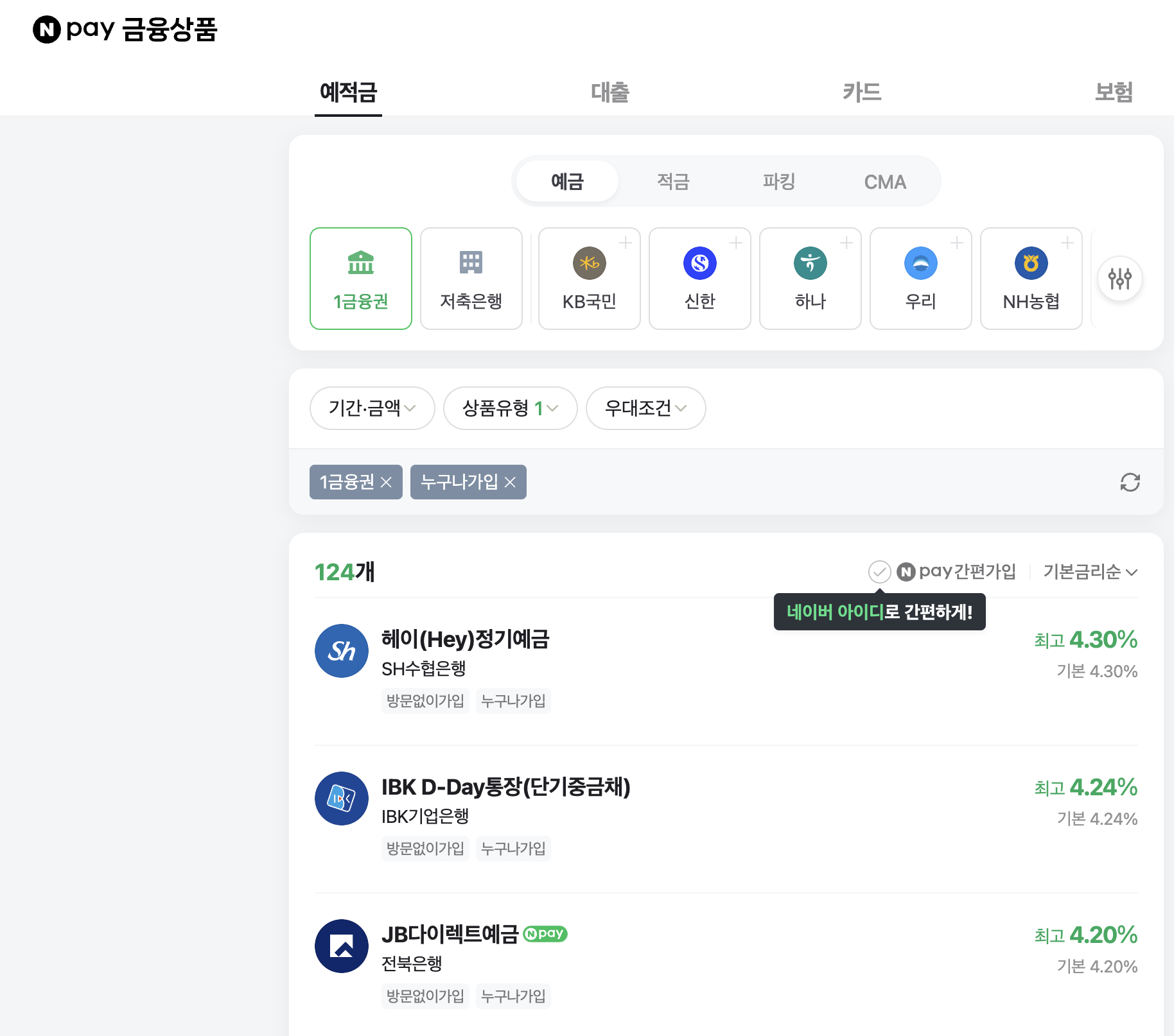 참고로 예금금리비교는 네이버페이 금융상품에서 비교해 보면 손쉽게 비교해 볼 수 있습니다.