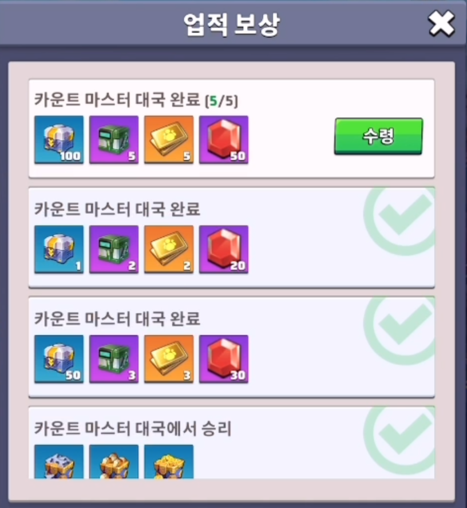 업적 보상으로 주는 다이아가 총 100개로 쏠쏠합니다. 카운트 마스터 게임이 뜨면 놓치지 말고 플레이해서 업적 보상 꼭꼭 챙기세요~~