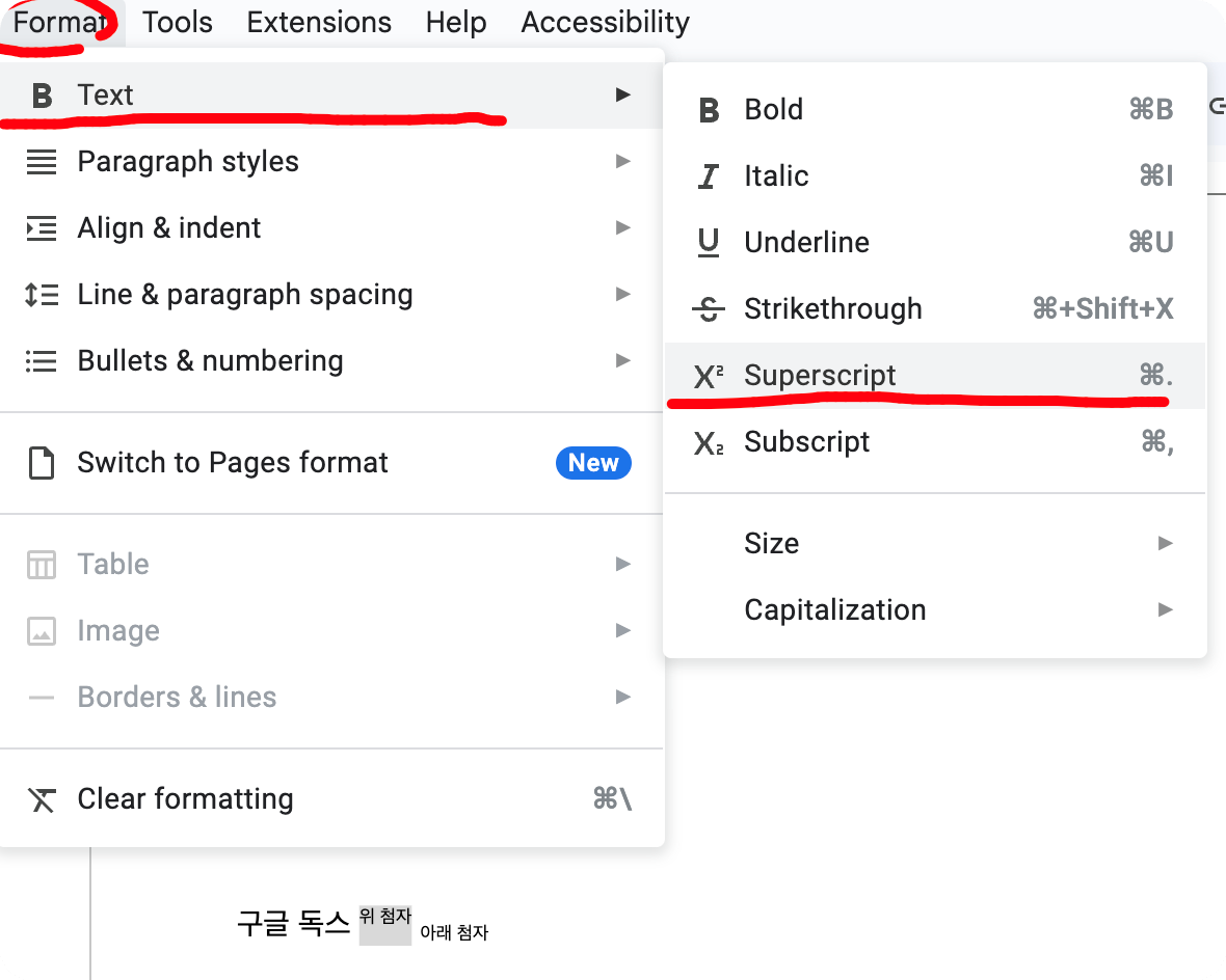 위 첨자로 바꿀 텍스트를 블록 지정합니다. 그리고 Format (서식) > Text (텍스트) > Superscript (윗첨자)를 선택합니다.