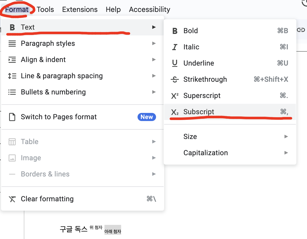 아래 첨자로 바꿀 텍스트를 블록 지정합니다. 그리고 Format (서식) > Text (텍스트) > Subscript (아래첨자)를 선택합니다.
