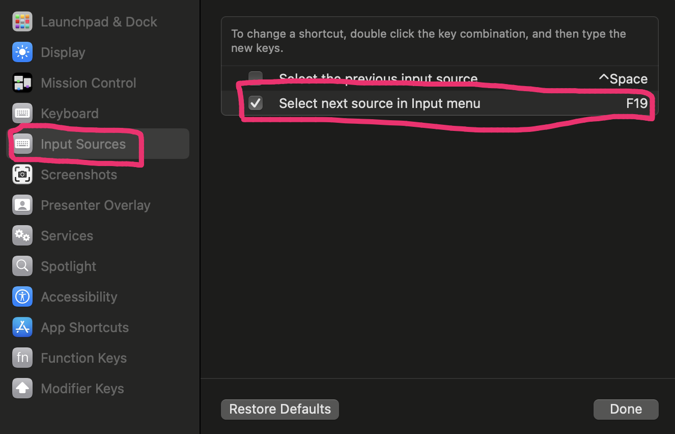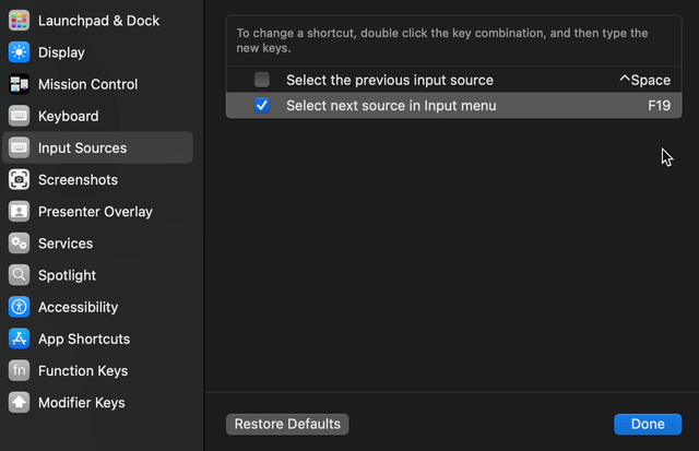 1번의 Input Srouces 설정에서 Select next source in input menu설정을 변경합니다. 오른쪽 Command키를 누르면 F19로 설정됩니다.