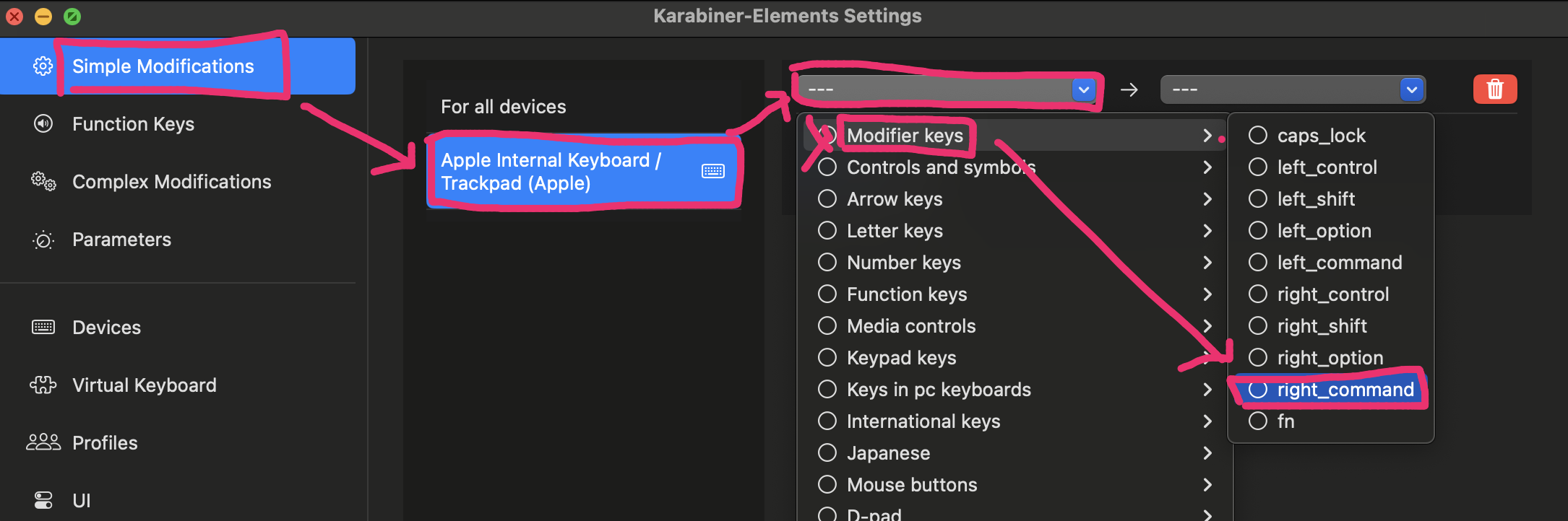 Karabiner-Elements 앱을 실행합니다. 앱이 실행되면 Simple Modifications > Apple Internal Keyboard를 선택합니다. 오른쪽에 있는 설정은 키보드의 어떤 키를 어떤 키로 변경할 것인지에 대한 설정입니다. Command키는 Modifier keys에 있습니다. 오른쪽 Command키를 변경할 것이기 때문에 right_command를 선택합니다.