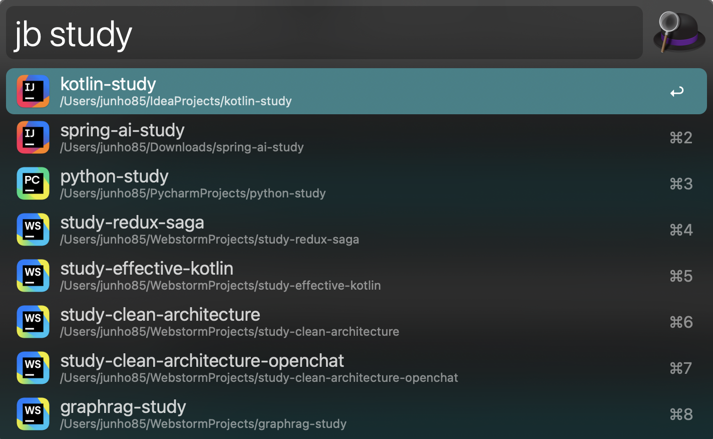 IDE 선택이 귀찮다면 그냥 "jb"를 입력하면 모든 JetBrains Tool에서 생성한 프로젝트들을 찾을 수 있습니다.
