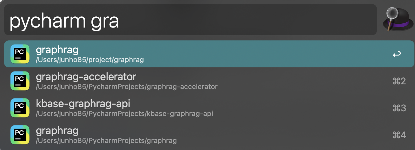 준호씨 2024. 8. 31. 16:10Alfred와 IntelliJ를 사용한다면 다음 워크플로우를 사용하면 JetBrains 툴에서 생성한 프로젝트들을 손쉽게 열 수 있습니다.