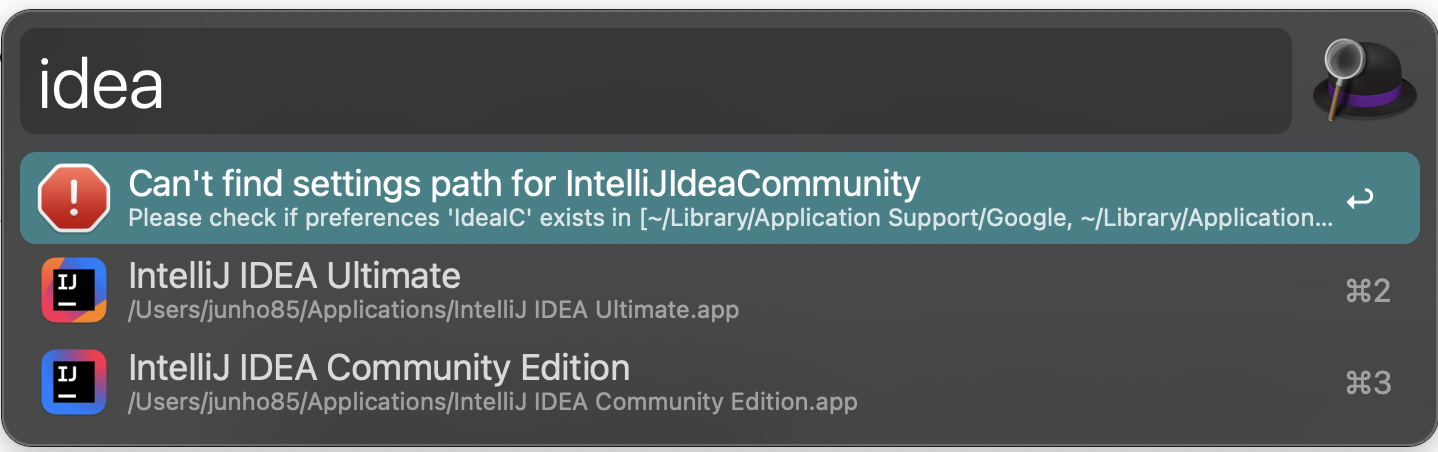 MacOS - Alfred - Can't fine settings path for IntelliJIdeaCommunity 오류 해결 본문