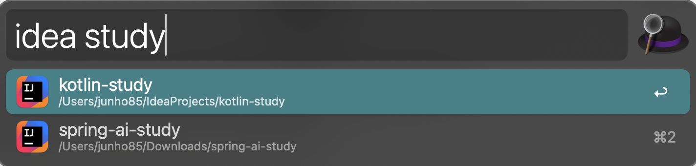 준호씨 2024. 8. 31. 16:10Alfred와 IntelliJ를 사용한다면 다음 워크플로우를 사용하면 JetBrains 툴에서 생성한 프로젝트들을 손쉽게 열 수 있습니다.