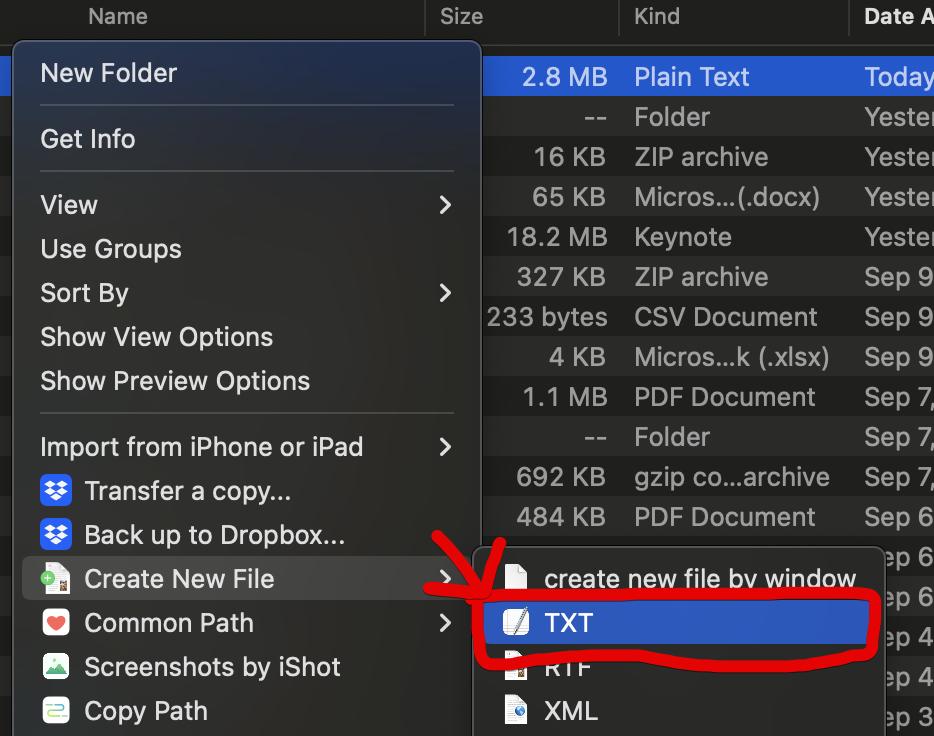 - 콘텍스트 메뉴에서 'Create New File' > 'TXT'을 선택합니다.