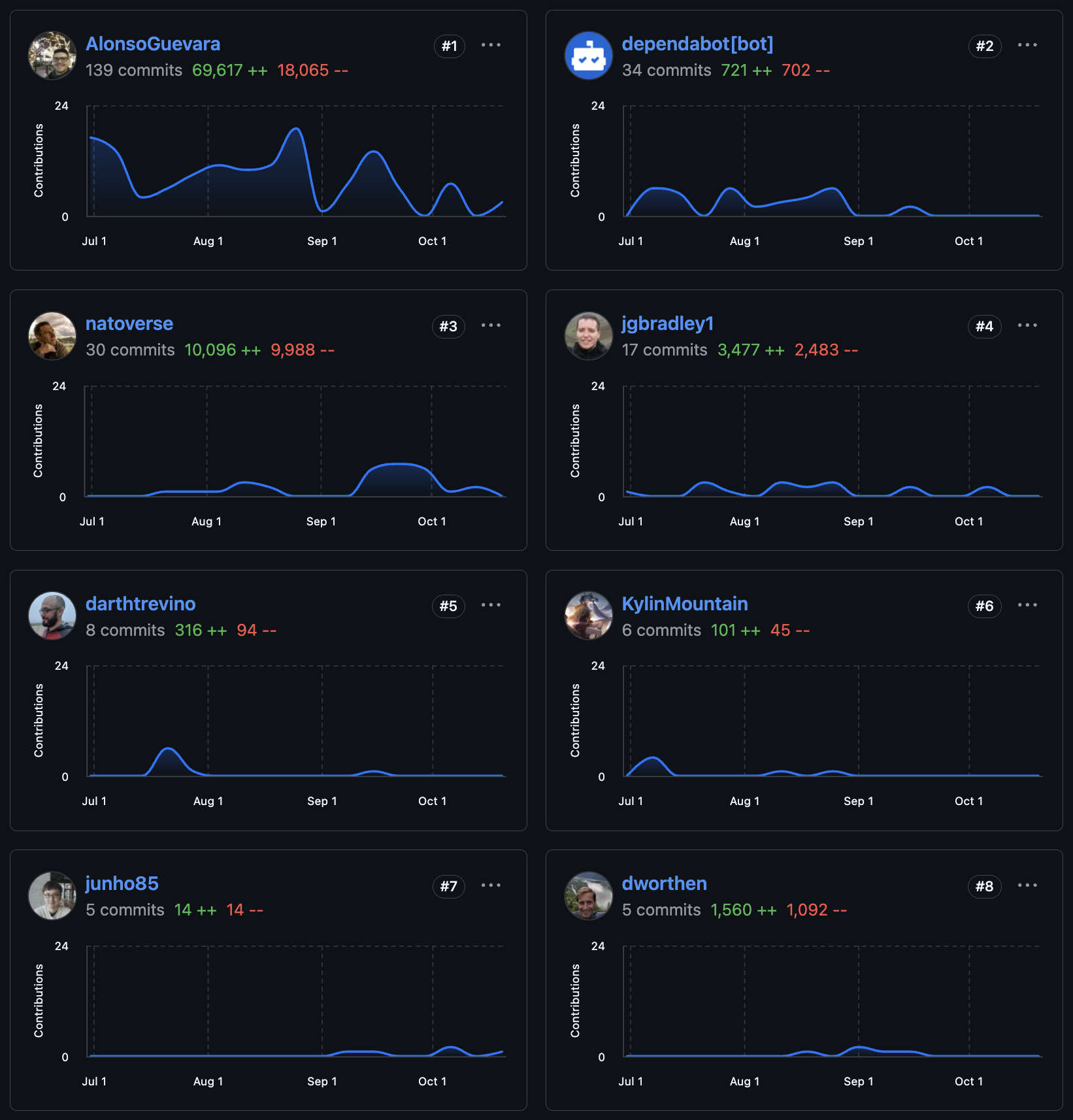 커밋 다섯 개 했고, 수정 내용은 14라인 정도밖에 안 되지만 벌써 7위가 되었네요. 좀 더 하다 보면 5위권 까지도 갈 수 있지 않을까 싶지만 그 위로는 쉽지 않을 것 같습니다. 다섯 개 커밋 내용은 사소한 오타 수정이나 문서 수정 정도인데요. 아직 라이브러리가 나온 지 오래되지 않다 보니 기능 변화가 자주 있고, 그 과정에서 이런저런 오타나 문서 갱신이 덜 된 경우가 종종 보입니다. 그래서 기여할 기회가 많은 편입니다. 제가 PR 했던 내용은 링크에서 확인해 볼 수 있습니다.