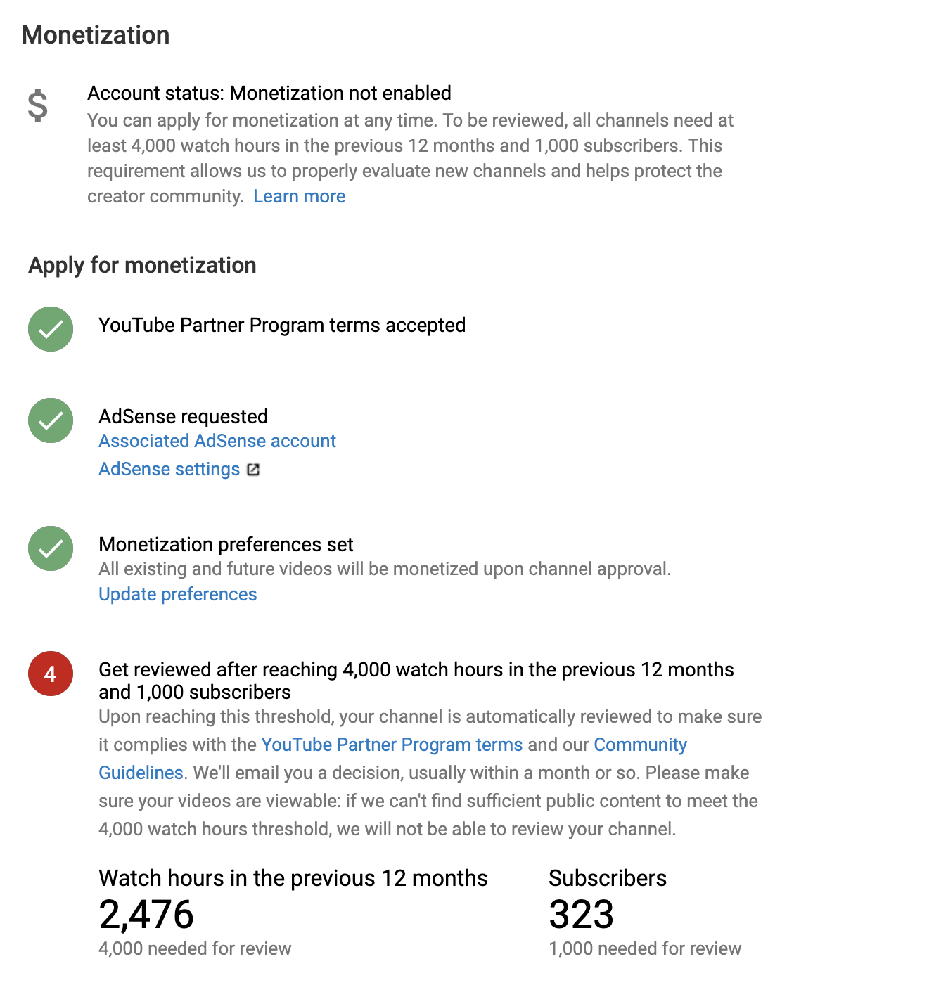 유튜브 수익화 신청은 조건 (최근 1년 구독시간 4000시간, 1000명 이상의 구독자) 에 도달하기 전에 미리 신청이 가능하네요.