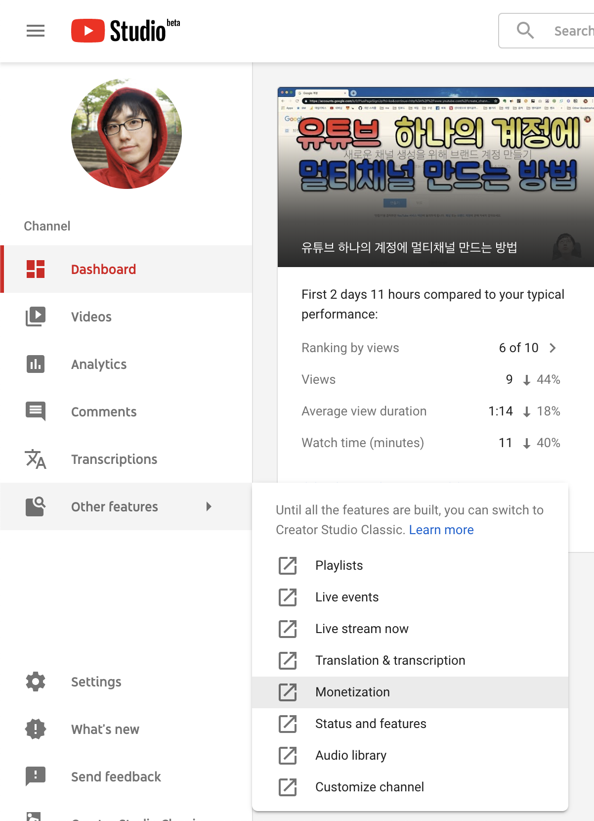 유튜브 스튜디오 -> Other features -> Monetization 으로 들어 갑니다.