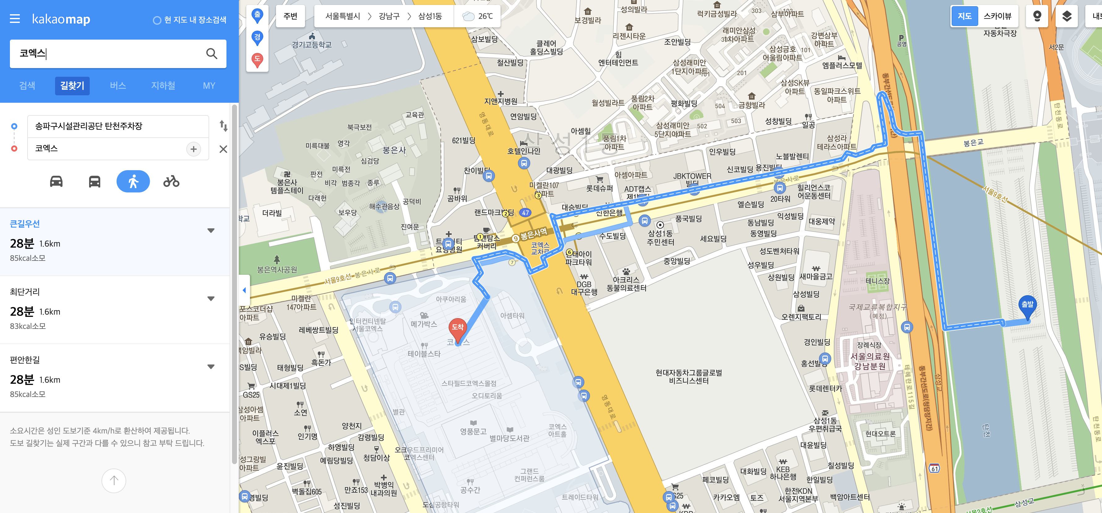 주차장에서 걸어서 14분 정도면 코엑스 까지 갈 수 있습니다. 이정도면 산책하는 느낌으로 금방 갈 수 있겠죠?