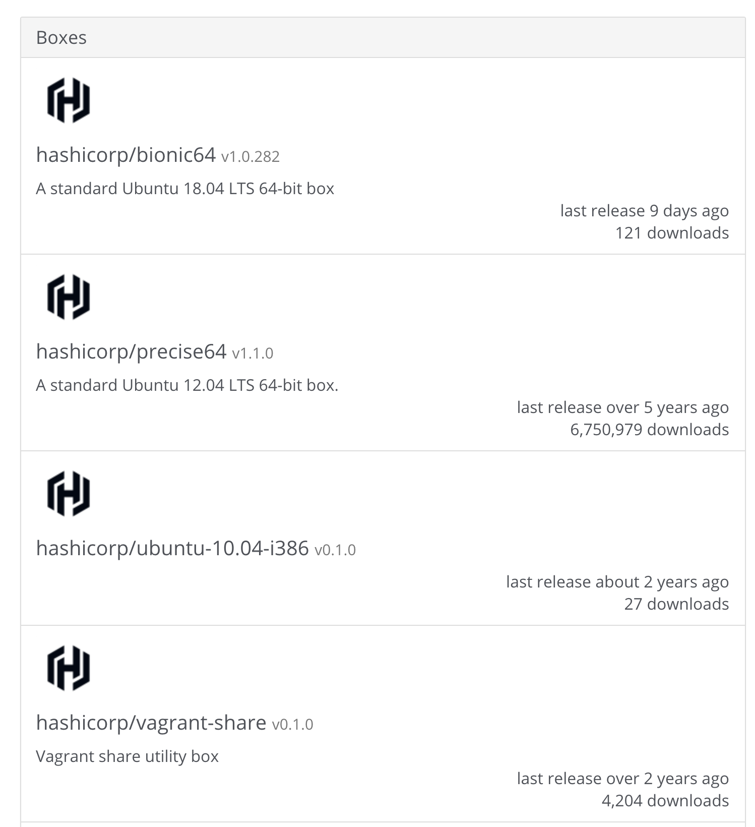 hashicorp/precise64 에 관련 정보는 https://app.vagrantup.com/hashicorp/boxes/precise64 에서 확인해 볼 수 있습니다.