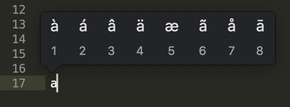 일부 키를 꾹~ 누르고 있으면 위의 그림과 같이 해당 알파벳의 특수형태 (움라우트 등)를 입력할 수 있는 화면이 나타납니다. 그런데 저런 문자를 입력할 일이 거의 없다거나, 반복 입력을 선호하는 경우 terminal 프로그램을 실행시킨 다음 아래 명령어를 실행시켜 줍니다.
