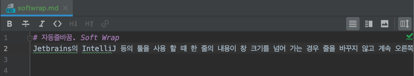 Soft-Wrap 을 활성화 해 주면 다음과 같이 긴 내용의 글이 창 사이즈에 맞춰서 여러줄로 표시됩니다.