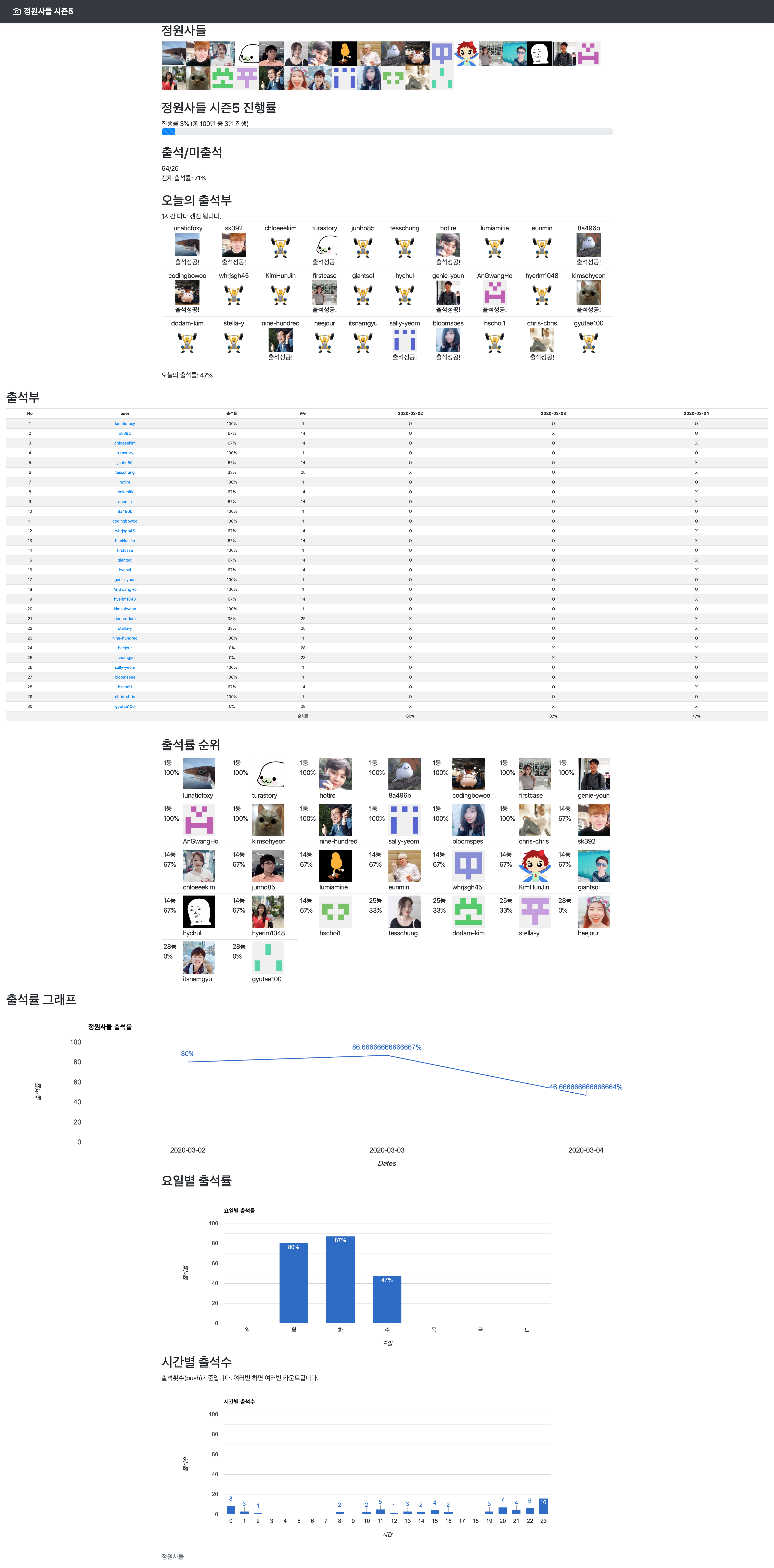 시즌4 때 출석부를 만들었었는데 시즌5 때도 그 출석부를 살짝만 고쳐서 사용하고 있습니다. 출석부는 http://garden5.junho85.pe.kr/ 에서 볼 수 있습니다.