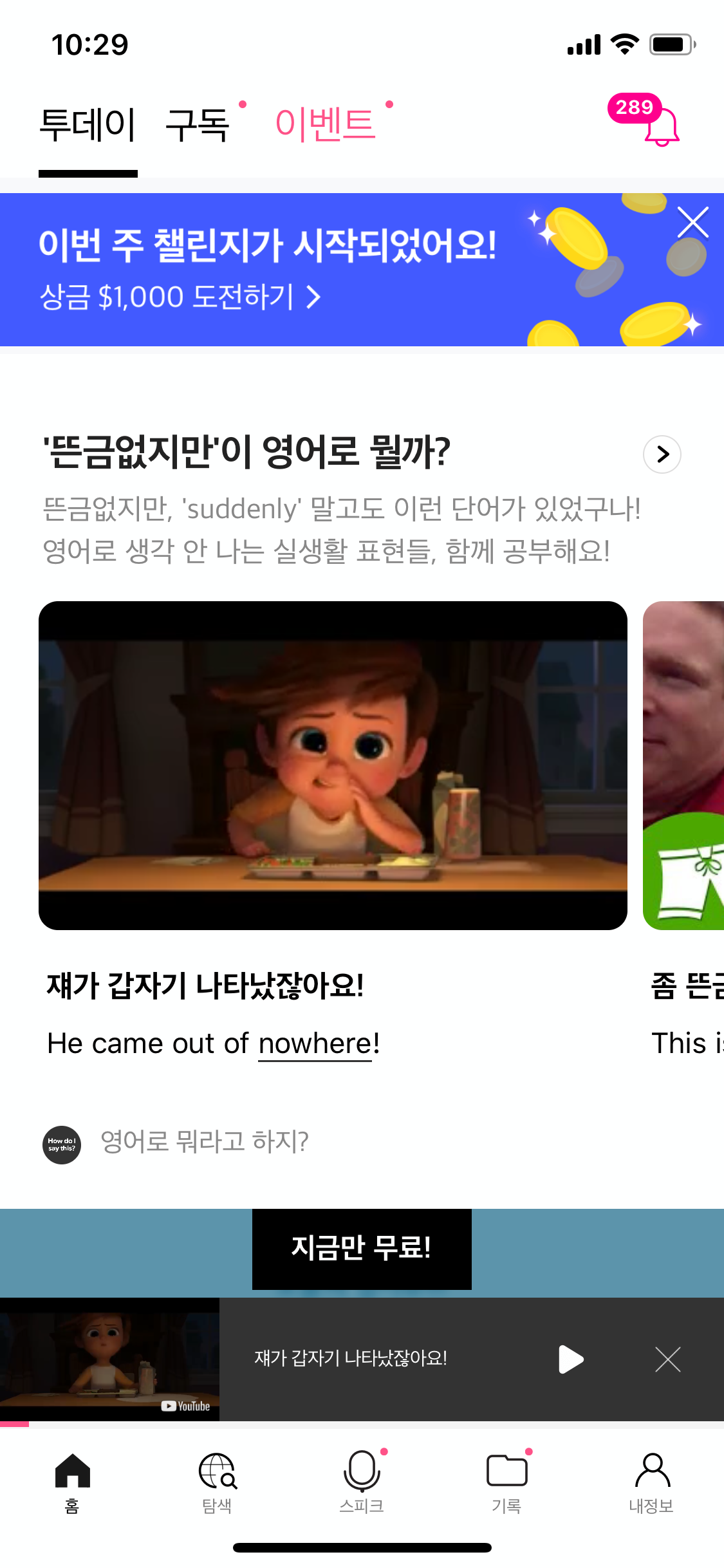 영상이 나오고 자막과 해석이 나옵니다. 속도도 조절 가능하고 특정 문장을 반복해서 들으면서 연습할 수도 있습니다. 자막을 가리거나 해석을 가릴 수도 있습니다. 아래쪽으로 내려가면 말하기 연습 기능이 보입니다.