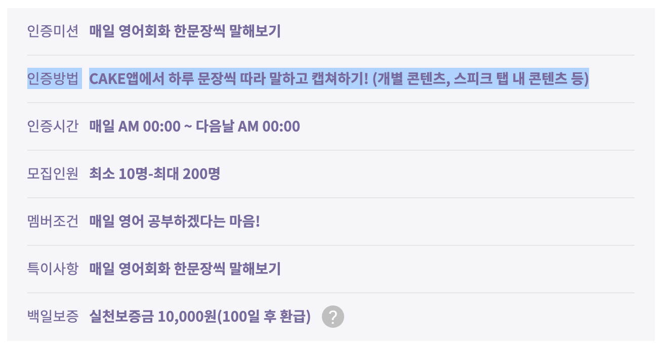 영어회화 프로젝트를 통해 인증과정을 살펴보겠습니다. 프로젝트 소개 페이지 (https://project100.kakao.com/project/945/introduce)에 들어가 보면 어떻게 인증을 할 수 있는지 방법이 적혀 있습니다.