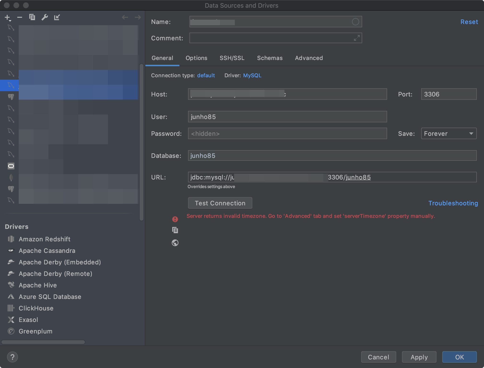 Jetbrains DataGrip - MySQL Timezone 접속문제 해결. Server returns invalid timezone. Go to 'Advanced' tab and set 'serverTimezone' property manually.