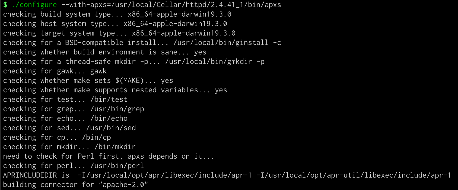 $ ./configure --with-apxs=/usr/local/Cellar/httpd/2.4.41_1/bin/apxs