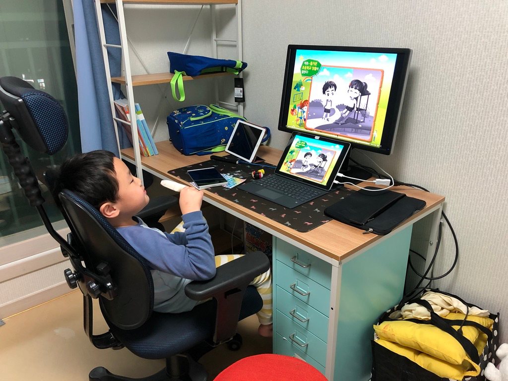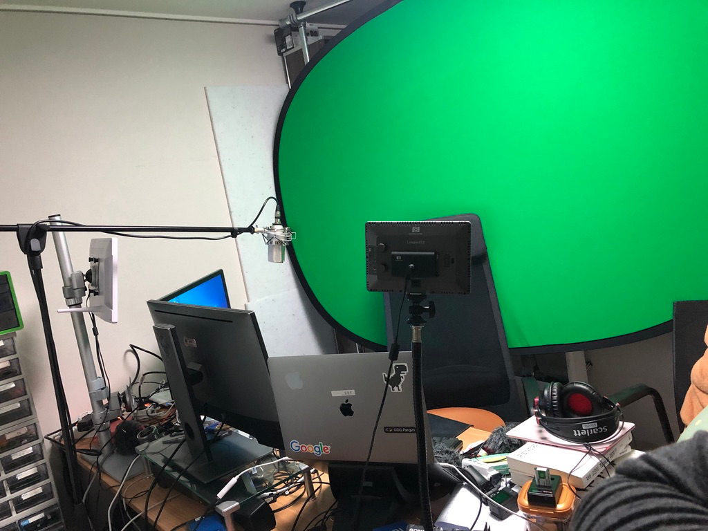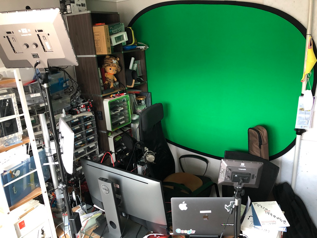 제 책상은 앞쪽으로 밀고 크로마키도 위치를 조정했습니다. 예전에는 크로마키 위치가 어정쩡해서 화면 범위 조정하기가 좀 어려웠었는데요. 이제는 크로마키 설정하기가 좀 더 수월해졌습니다.