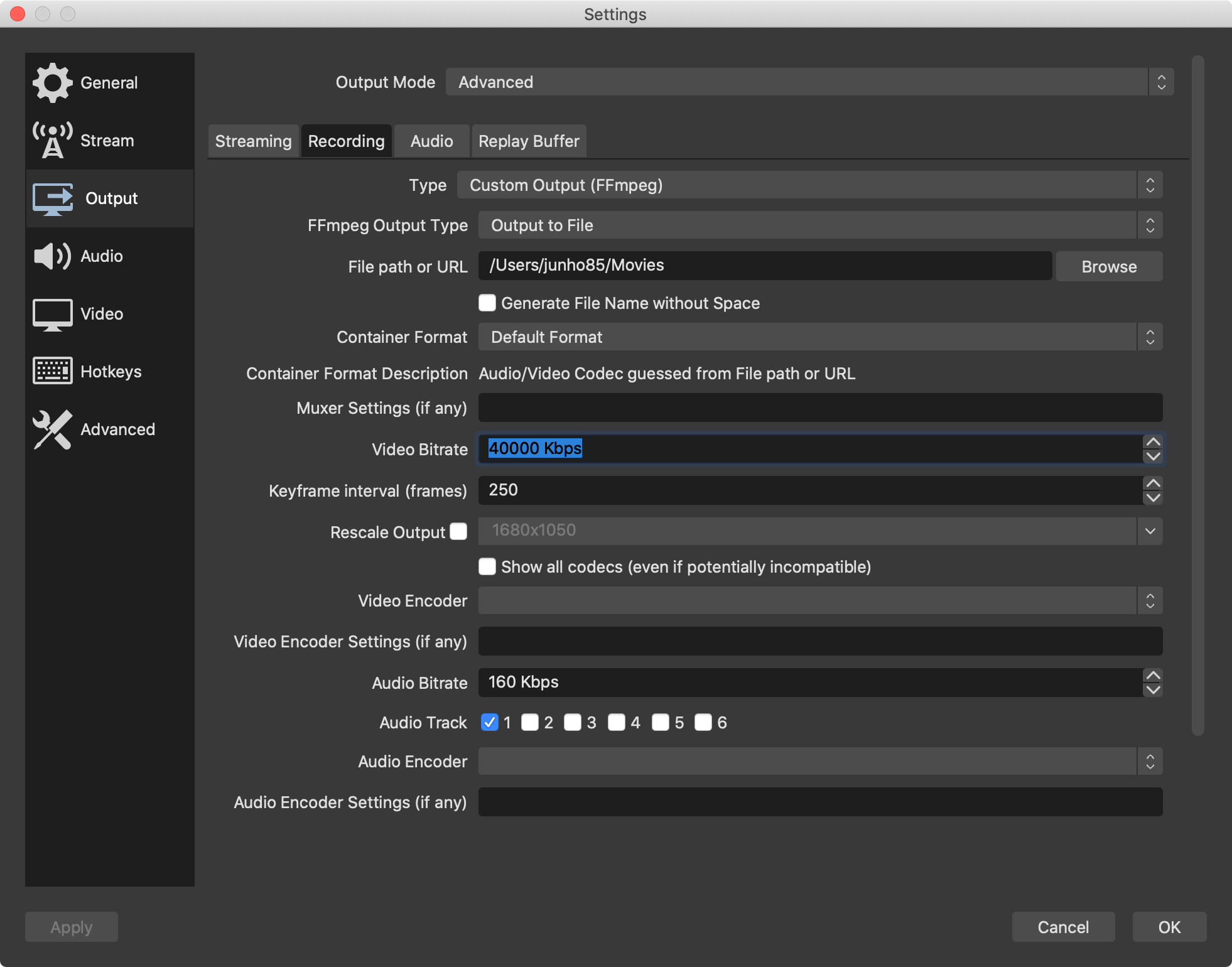 Settings -> Output -> Recording 부분 설정도 좀 더 높여 주면 좋습니다. Video Bitrate를 40000 Kbps로 올려 주었는데요. 이게 낮으면 점점 화질이 떨어집니다. 높여 주면 화질이 점점 좋아지지만 결과물의 용량도 커지니 주의해야 합니다.