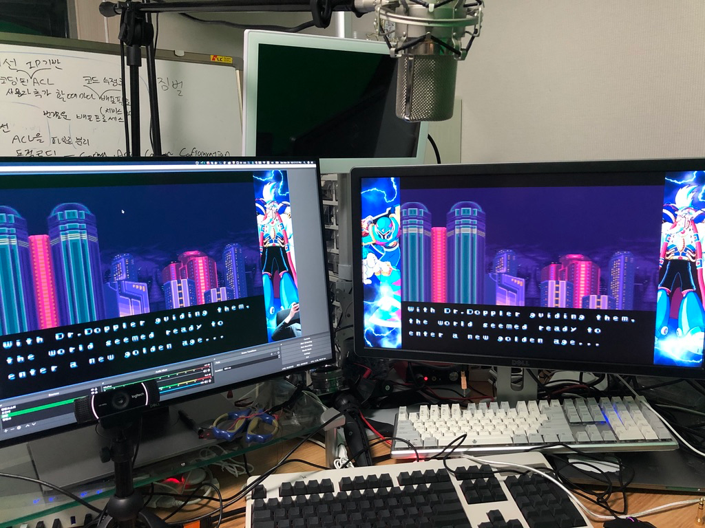 세팅이 다 된 모습입니다. 게임은 스팀에서 구입한 Mega Man Legacy Collection에 있는 Mega Man X3입니다. 윈도 PC에서만 플레이가 가능한데요. 오른쪽 모니터가 윈도 PC에 연결된 모니터입니다. HDMI 분배기와 캡처보드를 이용해서 맥북으로 영상을 보냅니다. 맥북에서는 OBS가 영상을 받아서 캠 영상과 오디오 인터페이스의 마이크 입력을 받아서 최종 영상을 만듭니다. 이 영상을 스트리밍 하면 라이브 방송이 됩니다. 트위치로 라이브 방송을 해볼까 했는데 하루 종일 설정만 하다가 끝났네요. 공략 영상은 녹화한 다음 유튜브에 올리면서 작업합니다.