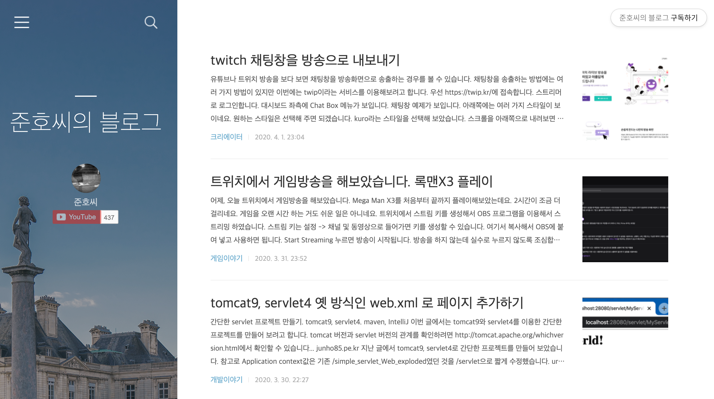 제 주 블로그는 지금 글을 적고 있는 티스토리 블로그입니다. 도메인은 따로 구입해서 연결해서 https://junho85.pe.kr/를 사용하고 있는데요. 실제 주소는 https://junho85.tistory.com/입니다.