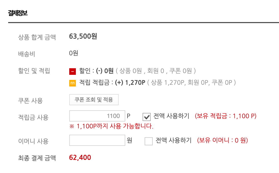 가입 적립금이 1000원이라고 했던 거 같은데 100원이 더 있네요. 1100원 할인을 적용해서 최종 62,400원에 구입이 가능하네요.
