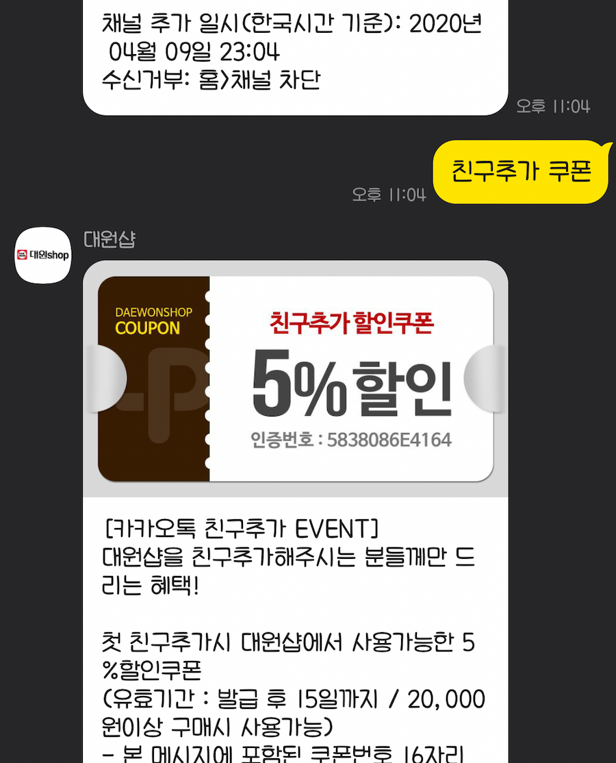 마침 대원 샵에 카카오톡 친구 추가하면 5% 할인 쿠폰을 준다고 하네요. 신규회원은 1,000원 적립금도 주고요.