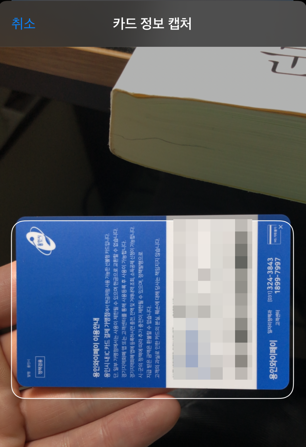 하지만 아무리 해도 신용 카드 스캔 인식을 못하더군요 ㅠㅠ 경기지역화폐 카드가 특이해서 그런지 그냥 안 되는 건지는 모르겠습니다. 그냥 카드 번호를 직접 입력하고 진행했습니다 ^^;
