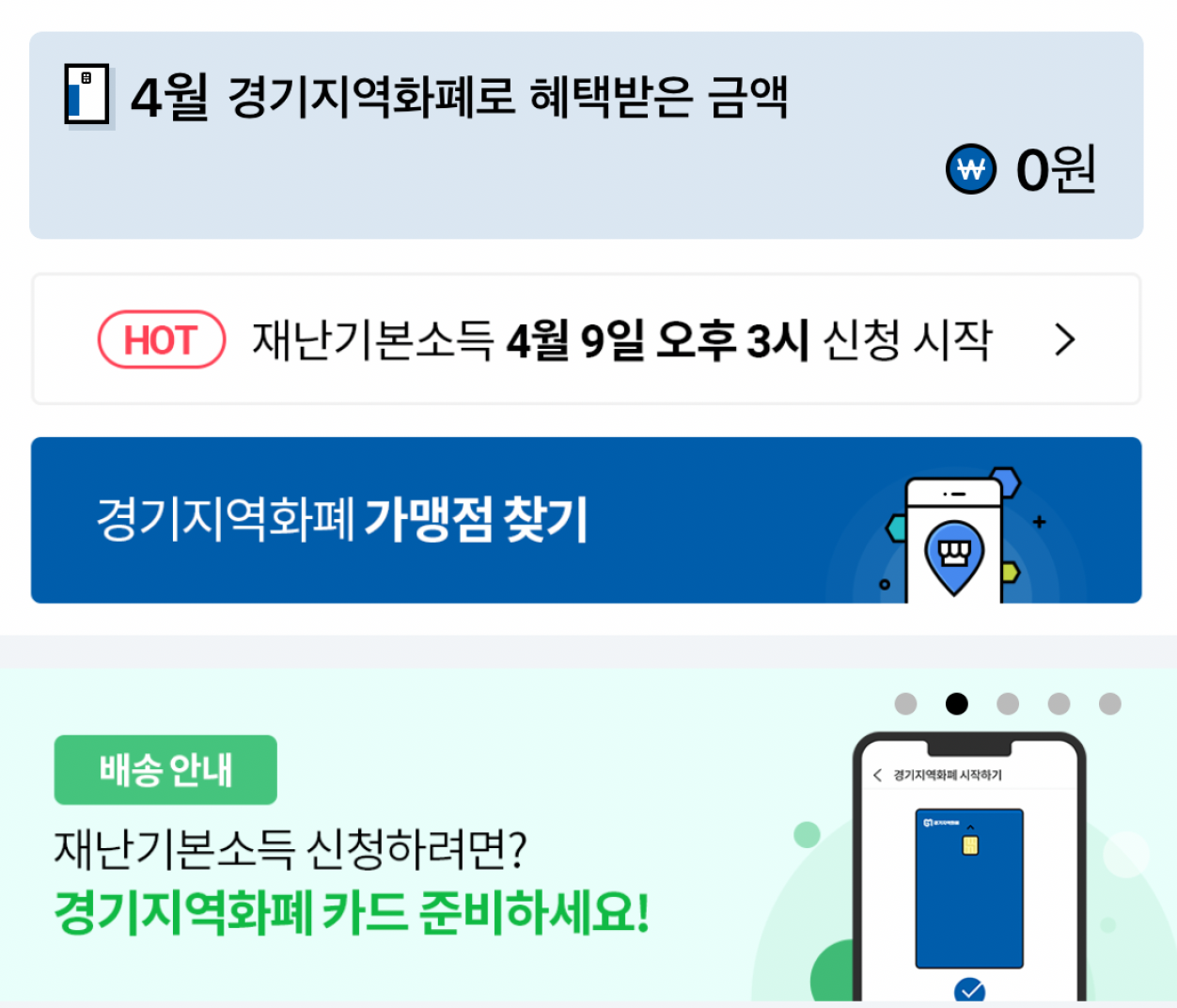 어제 4월 9일부터 온라인 신청이 시작되었는데요. 저도 신청해 보았습니다. 경기지역화폐 앱을 실행하면 첫 화면부터 경기도 재난 기본소득 신청 안내가 나옵니다.