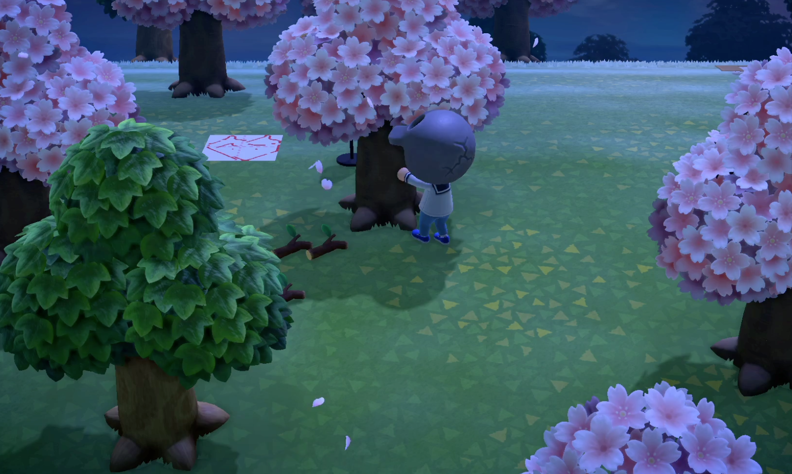 나무 앞에 서서 A를 누르면 나무를 흔듭니다. 흔들다 보면 나뭇가지가 떨어집니다. 안 떨어질 때도 있고 일정량이 떨어지고 나면 한동안은 잘 안 떨어지기도 합니다. 하지만 시간이 좀 지나고 다시 흔들면 또 떨어집니다. 나뭇가지는 낚싯대나 잠자리체 등을 DIY 해서 만들 때 필요한 재료로 유용하게 쓰입니다.