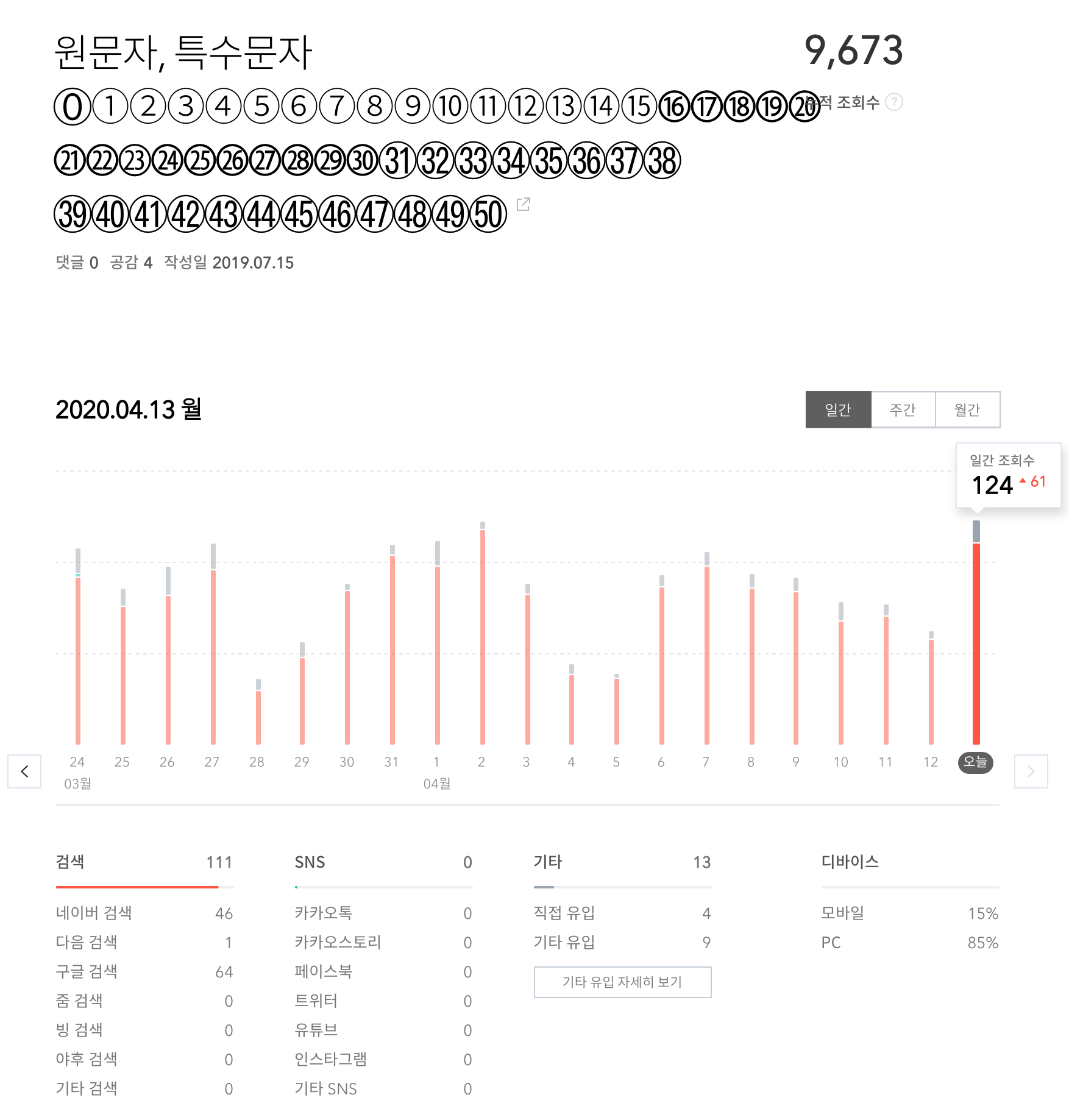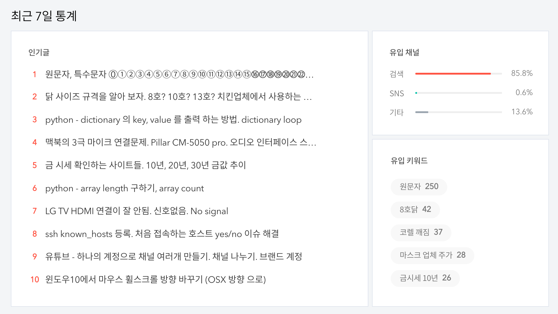 최근 7일간의 인기글 통계입니다. 닭 사이즈 규격 글이 꽤 오랜 기간 1등이었는데요. 원문자 글이 현재 1등을 하고 있습니다. 가끔 원문자 입력이 필요해서 만든 글인데 은근히 인기가 좋네요.
