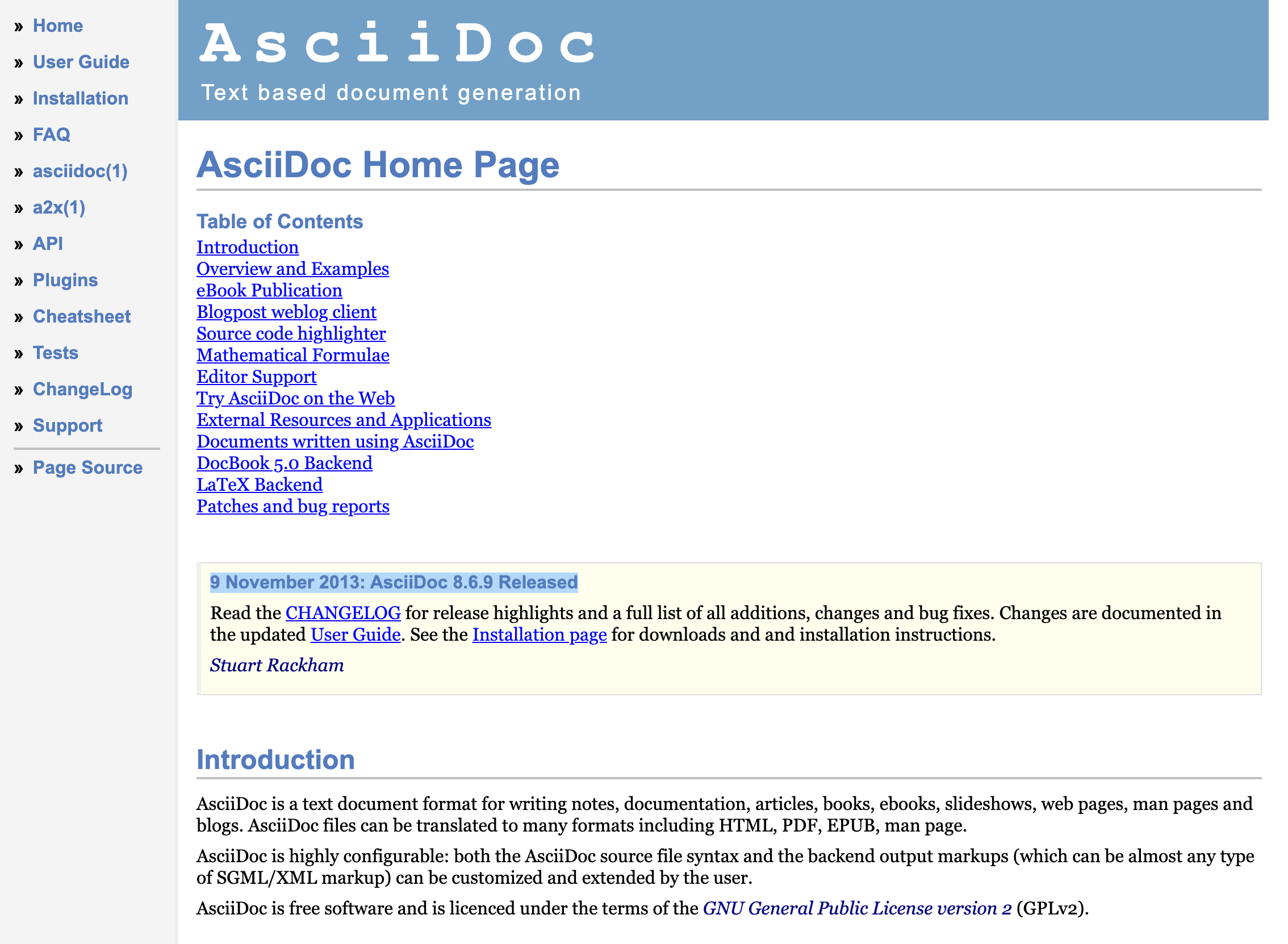 아아니... MarkDown은 심지어 2004년이 마지막 릴리즈였군요. AsciiDoc이 좀 더 최신(?) 기법이라고 봐도 되지 않을까 합니다. MarkDown이 이렇게 오래된 것이었다니 새삼 놀랍군요.