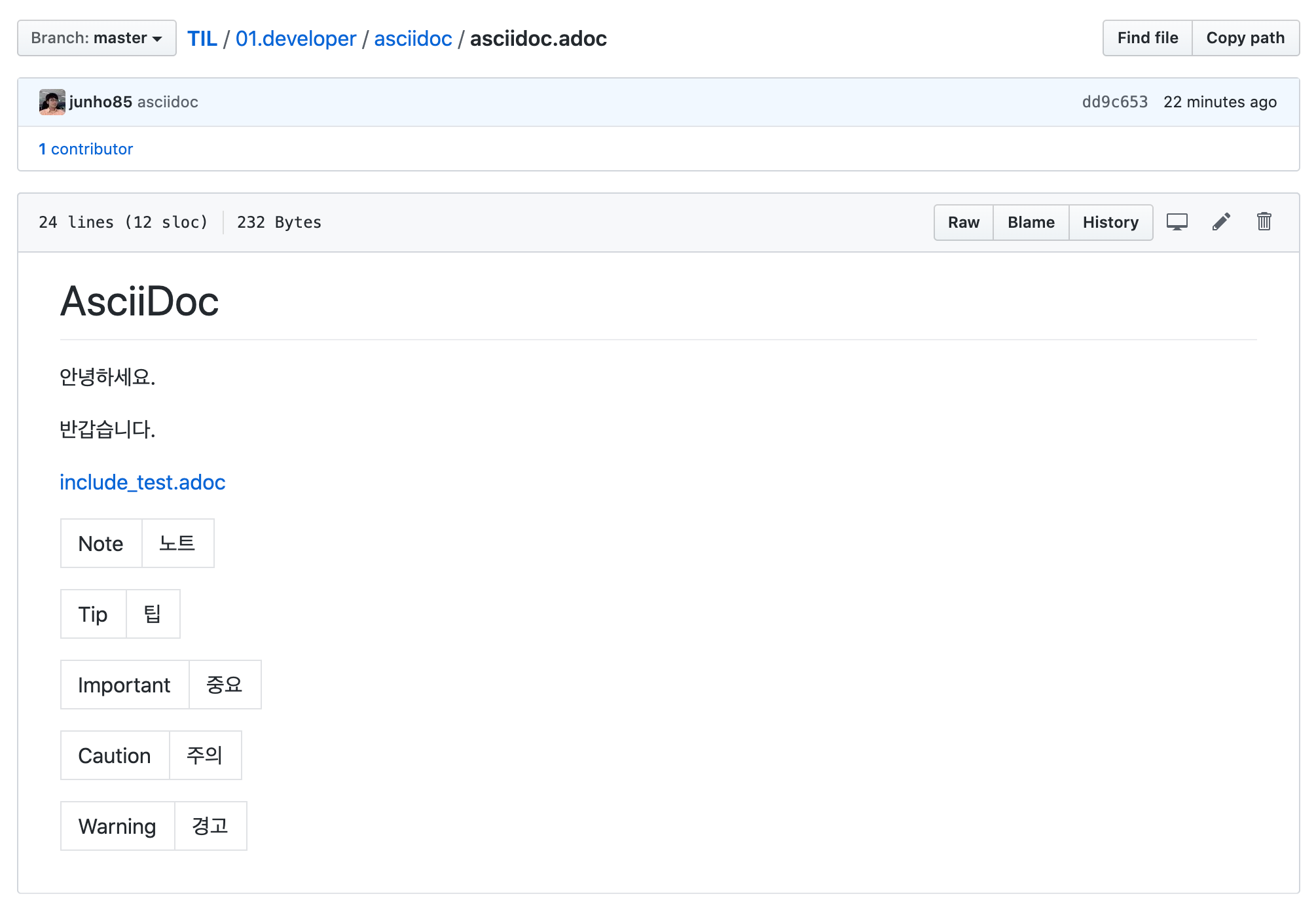 참고로 github에서도 AsciiDoc문서의 미리보기는 제공하고 있지만 include기능 까지는 제공해 주고 있지는 않습니다.