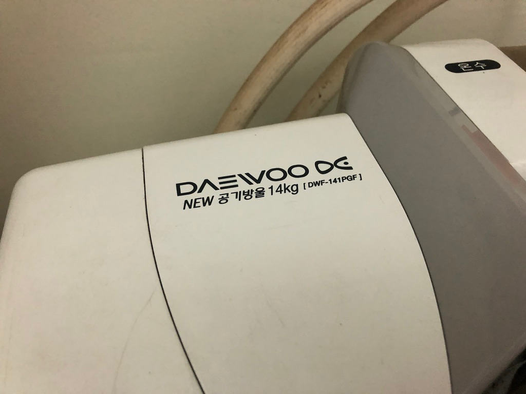 저희 집 세탁기는 대우 NEW 공기방울 세탁기 14kg DWF-141PGF입니다. 2013년 5월에 구입했네요. 홈플러스에서 35만 9천 원 주고 구입했습니다. 8년 정도 쓰다 보니 하나씩 상태가 안 좋아지고 있습니다.