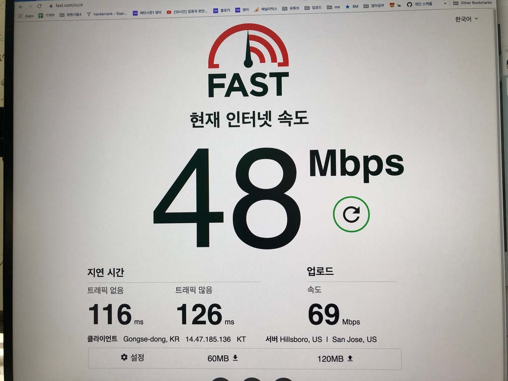 공유기가 있는 방에서 맥북프로에서는 48 Mbps 정도가 나오고요.