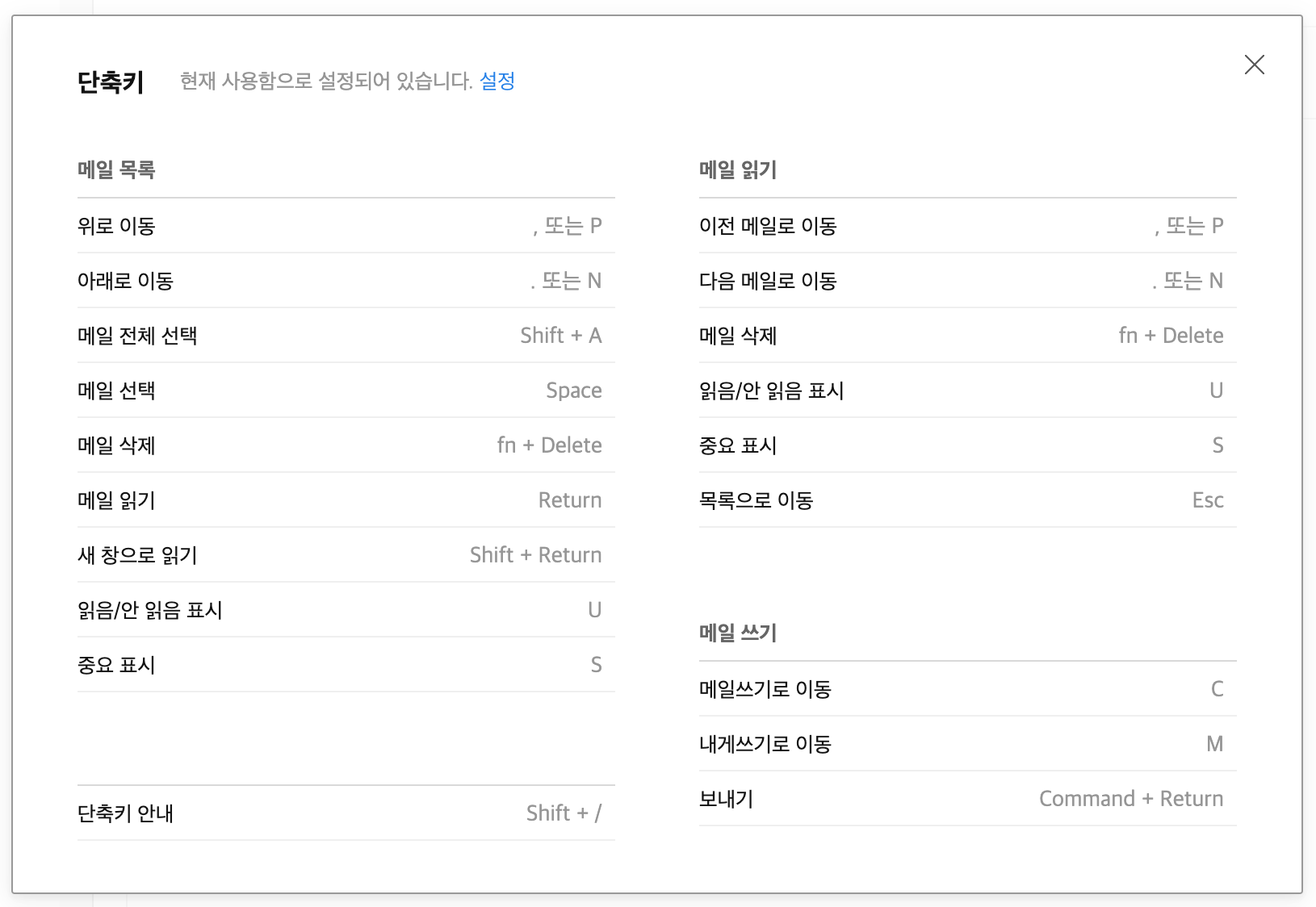 단축키 안내가 나타납니다. 메일에 중요 표시를 한다거나 메일 쓰기나 보내기도 할 수 있습니다. 단순히 메일 관리할 때는 키보드만으로도 다 할 수 있을 거 같습니다.