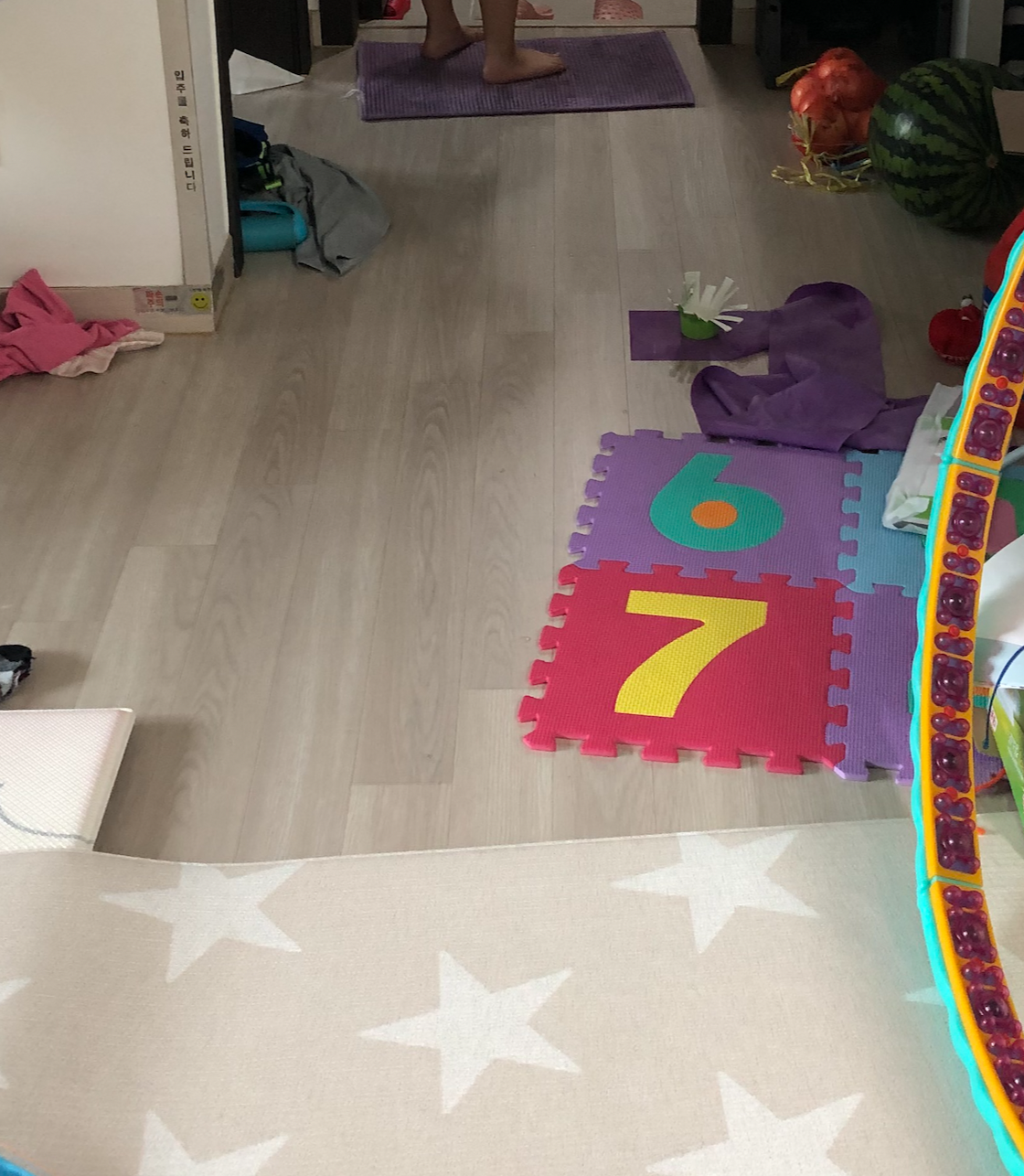 거실에서 사용하는 커다란 매트는 통로 부분에는 깔기가 애매하더라고요. 숫자 매트라도 깔아 두긴 하지만 이 매트들은 생각보다 충격 흡수가 잘 안 되는 것 같았고요. 제일 큰 문제는 청소가 불편하다는 점입니다. 숫자 같은 모양이 없고 좀 더 두꺼운 제품이면 좀 더 괜찮을 거 같긴 한데 아무튼 결국 끼우는 부분 부분 사이 틈으로도 먼지가 잘 들어갑니다. 그리고 매트 자체가 오염되어도 청소가 잘 안되더군요.