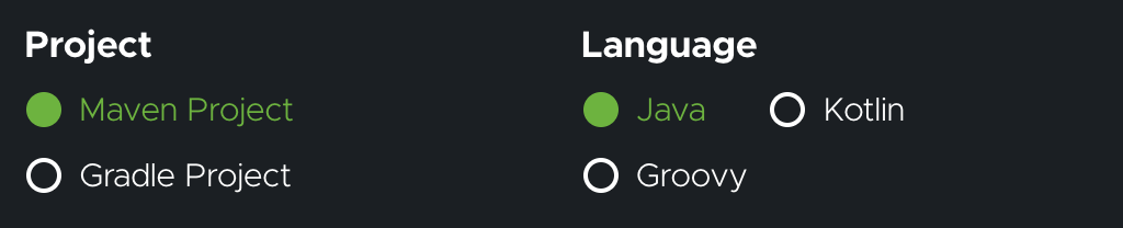 기본은 Maven Project로 생성되는데 Gradle로도 바꿀 수 있습니다. 언어는 Java, Kotlin, Groovy를 선택할 수 있습니다.