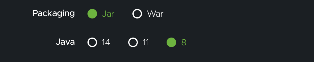 패키징을 jar로 할지 war로 할지도 선택할 수 있고요. 스프링 부트는 Jar패키징을 많이 하는 편이나 Jar가 기본 선택되어 있습니다. Java는 8이 기본 선택되어 있는데요. 요즘은 점점 11로 많이 넘어가고 있어서 언젠가 11이 기본으로 올라가지 않을까 싶습니다.