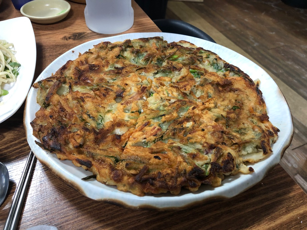 해물 파전입니다. 그냥 먹기에는 좀 심심해서 간장소스를 찍어 먹어야 적당한 거 같았고요. 기대했던 것보다는 해물이 좀 적고 밀가루가 많이 들어가서 제 입맛에는 그냥 보통이었습니다. 아내는 맛있다고 하더군요.