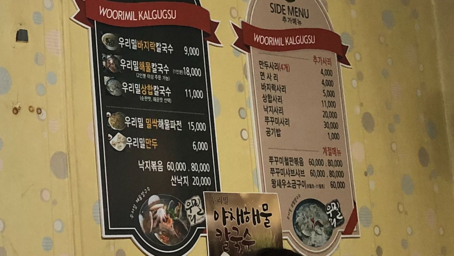 메뉴는 이렇게 구성되어 있는데요. 해물 칼국수 많이 먹는다는 거 같아서 우리밀 해물칼국수 1인분 18,000원 2인분에 해물파전 15,000원을 시켜먹었습니다. 야채 해물칼국수 1인분 13,000원짜리가 있었는지 몰랐는데 이건 어떤 차이가 있을지 궁금하네요. 해물이 좀 더 적게 들어 있을 거 같긴 합니다.
